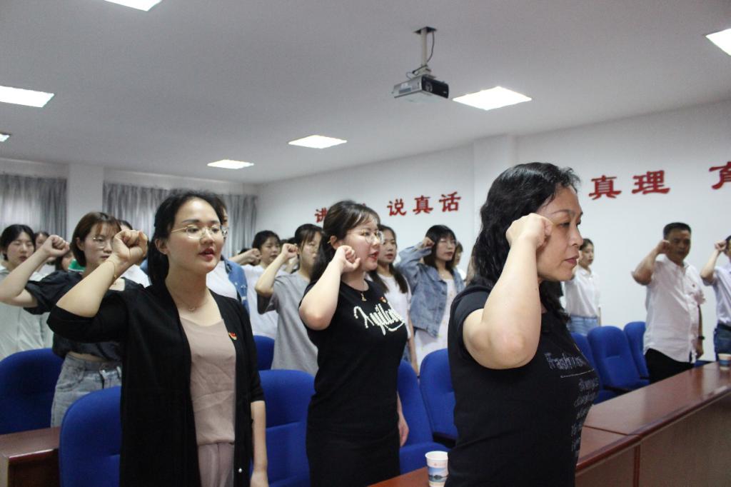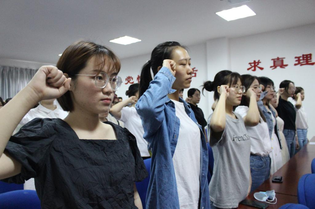 在院党委副书记邓栗同志的带领下,全体预备党员起立,面向党旗,右手握拳,高举过肩,进行神圣的入党宣誓,铿锵有力的宣誓声彰显着预备党员们入党的信念与觉悟。