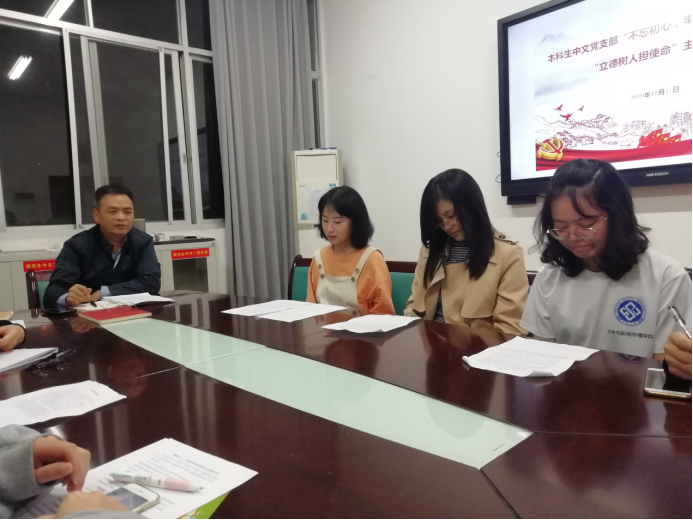 10月17日晚9点,文新院本科生中文党支部在文法楼234会议室召开“不忘初心,牢记使命”主题教育“立德树人担使命”专题研讨会。学院党委书记罗军飞同志出席,支部全体党员参加会议。