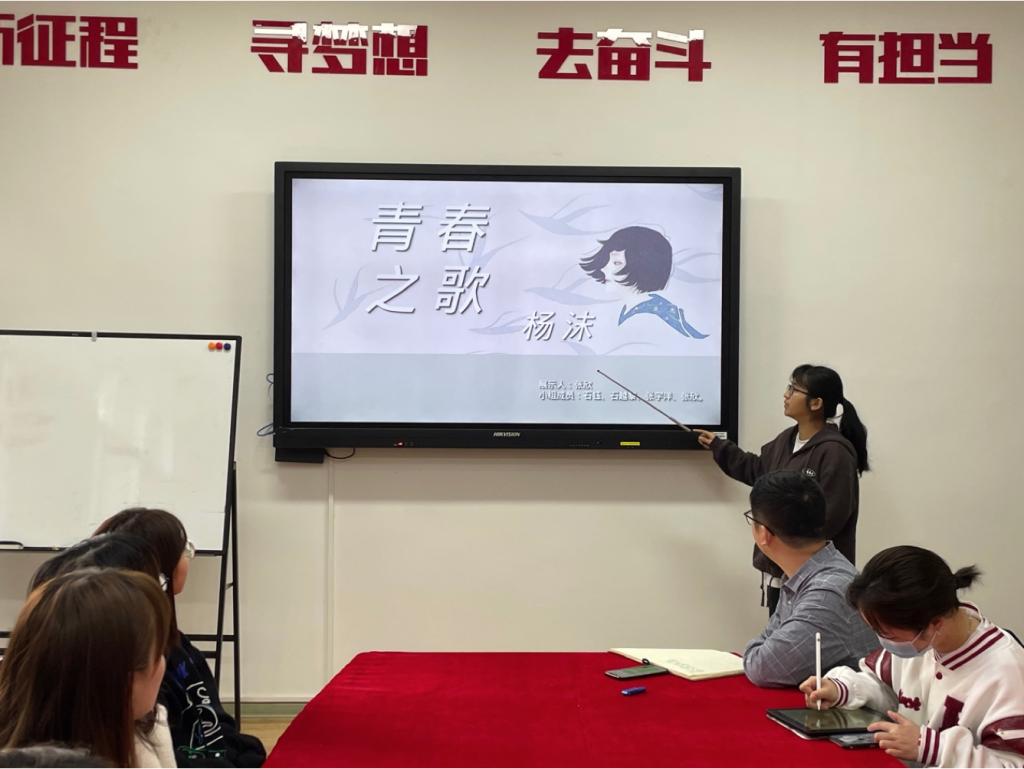 张欣小组给大家分享了杨沫的长篇小说《青春之歌》,作品是作者以亲身经历为素材创作的半自传体小说,小说以20世纪30年代日本侵华过程中发生的“九·一八事变”到“一二·九运动”的爱国学生运动为背景,描写了女主人公林道静的成长故事。小组成员认为该部作品构筑了革命历史的经典叙事,也揭示出知识分子成长道路的历史必然性,是学生和知识分子题材作品中的优秀成果,有很大教育作用。
