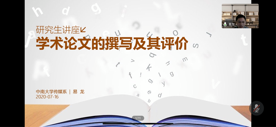 7月16日晚,由yl88858永利集团学生工作部(处)主办的学术讲座系列以线上会议的形式顺利举行。本次主讲人为文学与新闻传播学院党委委员、传媒系主任、硕士研究生导师易龙老师,讲座主题为《学术论文的撰写及其评价》。