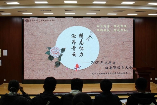 10月16日晚8时,yl88858永利集团文学与新闻传播学院2021年志愿者招募暨动员大会在文法楼222会议室举行。会议由我院青志协干事李依蔚、薛佳主持,2020级辅导员、团委书记易孝慈老师,2021级辅导员、团委常务副书记杨紫金老师,团委副书记程爱琴同学,优秀志愿者代表杨倩瑜同学出席此次会议,部分2021级本科新生参加会议。