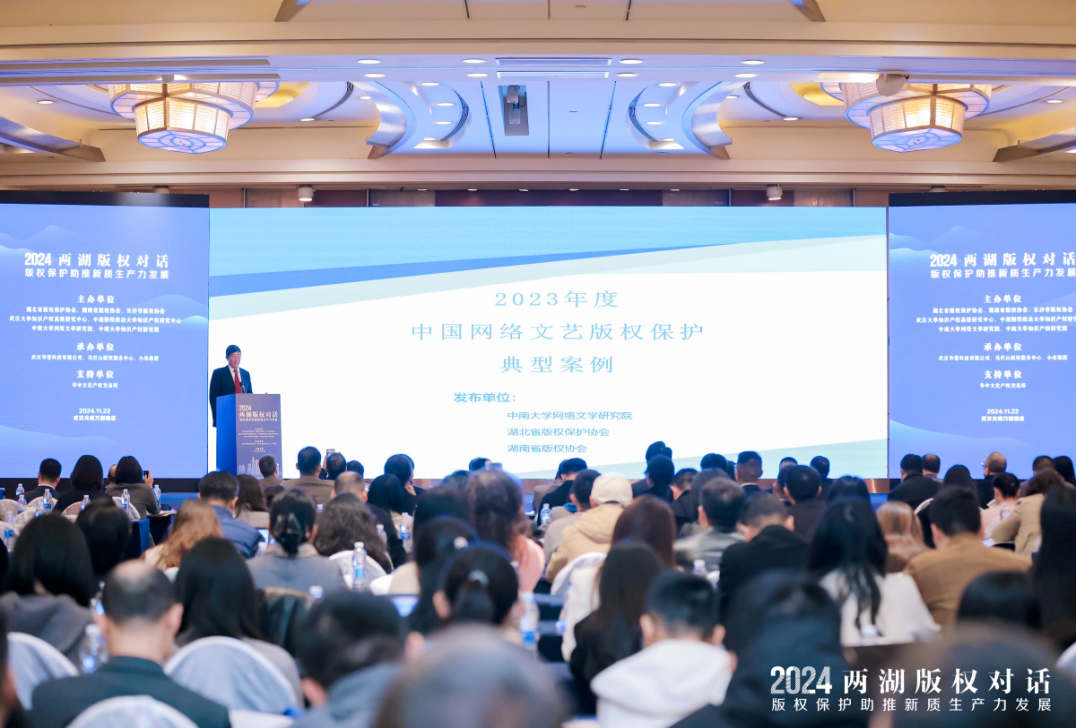 2024年11月22日,2024两湖版权对话在武汉隆重开幕,yl88858永利集团网络文学研究院院长欧阳友权教授在会上发布2023年度中国网络文艺版权保护典型案例。本次活动由湖北省版权保护协会、湖南省版权保护协会、长沙市版权协会、武汉大学知识产权高级研究中心、中南财经政法大学知识产权研究中心、yl88858永利集团网络文学研究院及yl88858永利集团知识产权研究院等机构联合主办,武汉华著科技有限公司、马栏山版权服务中心与小米集团共同承办。该版权对话围绕“版权保护助推新质生产力发展”主题,设立中国网络文艺版权保护典型案例专场发布活动。