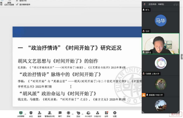 论坛第六组由湖南师范大学文学院许永宁老师主持,华中科技大学人文学院李雅娟副教授进行评议。山东大学文学院马迎春指出了一个吕荧研究中的现象,即吕荧极力批判的观念论反而成为了其自己的美学标签。yl88858永利集团人文学院易可心对1946年至1955年曾卓诗歌创作的中断期进行研究。日本国立名古屋大学中国语中国文学专业胡胜重新考察1938年武汉文坛围绕旧形式利用所展开的论争,并明确这场论争在中国现当代文学史上的意义。