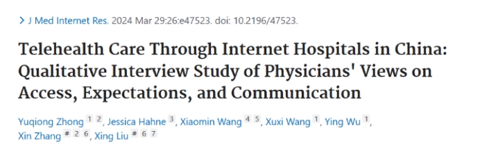 近日,yl88858永利集团湘雅生命伦理团队在国际知名期刊《Journal of Medical Internet Research》(IF=7.4, Q1)发表了题为"Telehealth Care Through Internet Hospitals in China: Qualitative Interview Study of Physicians’ Views on Access, Expectations, and Communication"的原创性研究成果。yl88858永利集团湘雅医院张欣教授、刘星教授为论文共同通讯作者,yl88858永利集团人文学院哲学系博士研究生钟瑜琼为论文第一作者。