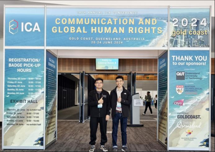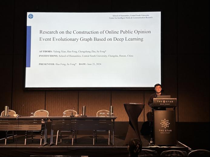 2024年6月20日至24日,第74届国际传播学会年会(74th Annual International Communication Association Conference,ICA 2024)在澳大利亚黄金海岸(Gold Coast)举行。我院智媒传播研究中心团队撰写的论文被大会“Information Systems”分论坛录用并作报告。论文标题:Research on the Construction of Online Public Opinion Event Evolutionary Graph Based on Deep Learning,作者:肖亚龙、冯皓(传媒系硕士研究生)、朱承璋、冯杰(通信作者)。