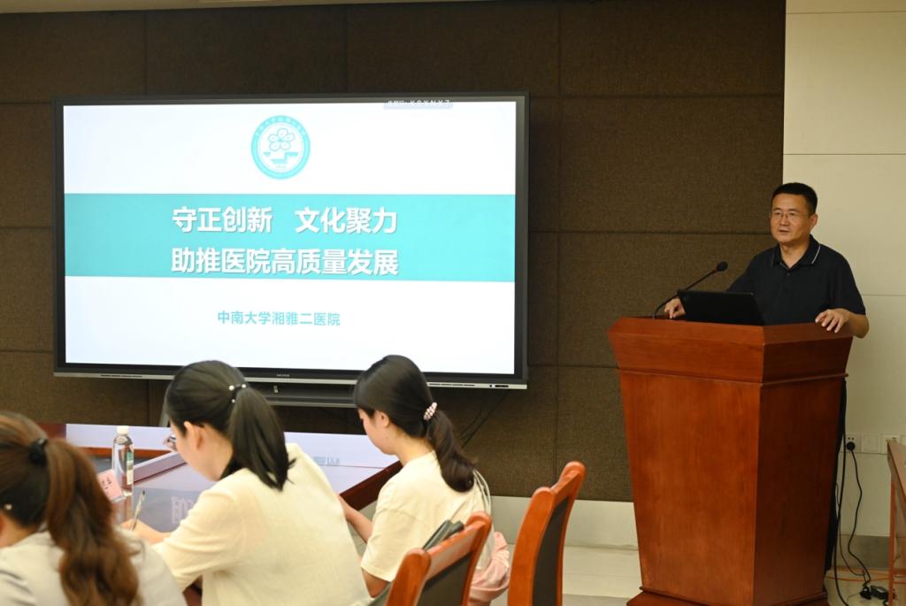人文学院党委书记罗军飞对湘雅二医院的文化建设工作予以肯定。他认为,湘雅二医院在文化建设工作中成绩显著。打造湘雅二医院特色文化需深挖自身红色基因,结合“生在新中国,长在红旗下“的独特办院历史,打造自己的湘雅名医。对内着眼于宣传正面文化加强职工文化认同,对外展现对党忠诚、为人民服务的责任担当,力争从多维度提升医院美誉度,成为光荣伟大奋进的湘雅二院。罗军飞提出,在今后的发展中要加强人文学科与医学学科的深度交流合作,通过人文教育实现医学人才的全方位发展,提升医院人才队伍综合素养。