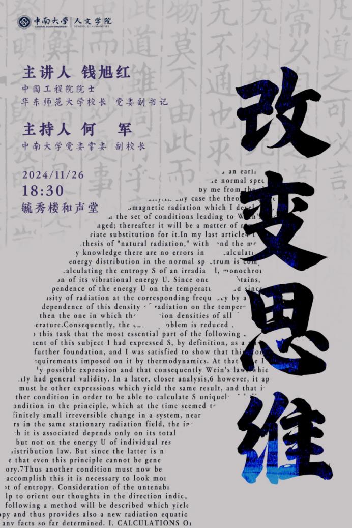 中国工程院院士、华东师范大学校长、党委副书记钱旭红教授学术报告《改变思维》,来一场思维方式的变革。