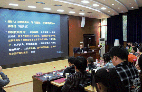 李健教授以自己的摄影作品《又是一年毕业季》《怒族出了个女博士》为例,向在座师生分享了拍出好照片的方法。针对拍什么与怎么拍,李健教授认为,拍摄是作者灵魂的写照,拍什么,在很大程度上取决于一个人的精神追求和价值取向。拍摄者应把镜头更多对准身边的人和事,普通人的生活也是历史的缩影,小题材同样能够出大作品。
