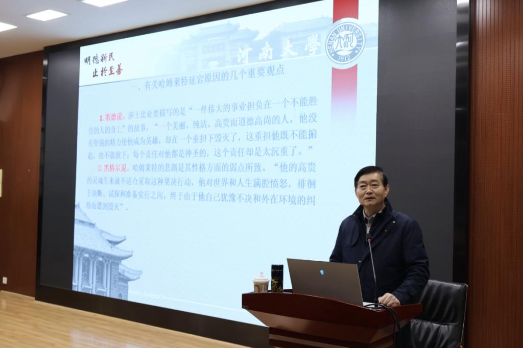 12月19日下午,河南大学文学院教授、博士生导师,河南大学莎士比亚与跨文化研究中心主任,中国语言文学博士点一级学科带头人,国家级一流本科专业负责人,《河南大学学报》编辑部主任、主编李伟昉,应邀为我院师生讲学,以“哈姆雷特延宕内涵再审视”为题开展讲座。讲座由人文学院纪海龙副教授主持。我院晏选军、翟鹿老师以及来自人文学院的几十位研究生、本科生参与此次活动。