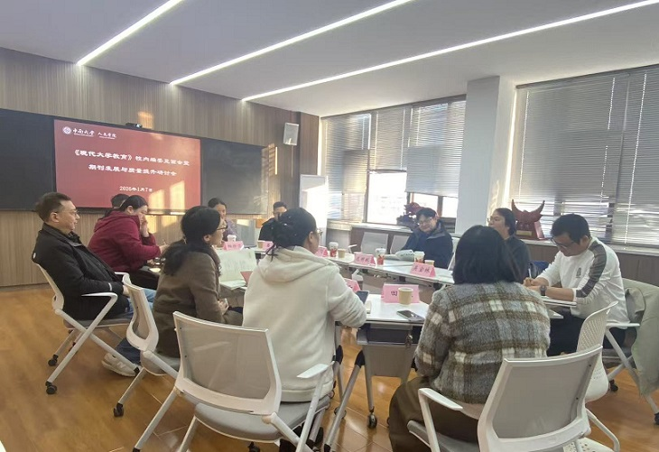 2026年1月7日,《现代大学教育》校内编委见面会暨期刊发展与质量提升研讨会在yl88858永利集团升华后楼顺利召开。人文学院院长范明献,校内青年编委易龙、吴宝林、袁超、莫甲凤,《现代大学教育》常务副主编庞青山、副主编曾山金等编辑部成员参会。会议由曾山金主持。