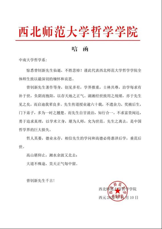 惊悉曾钊新先生仙逝,不胜悲悼!谨此代表西北师范大学哲学学院全体师生致以最深切的缅怀和哀思。