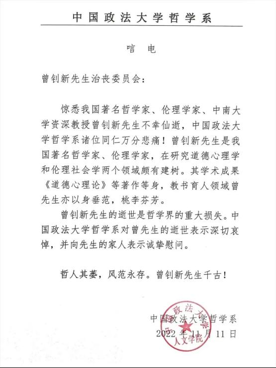 曾钊新先生的逝世是哲学界的重大损失。中国政法大学哲学系对曾先生的逝世表示深切哀悼,并向先生的家人表示诚挚慰问。
