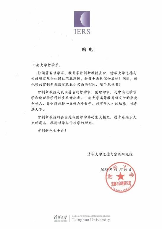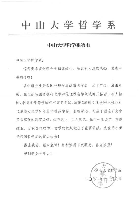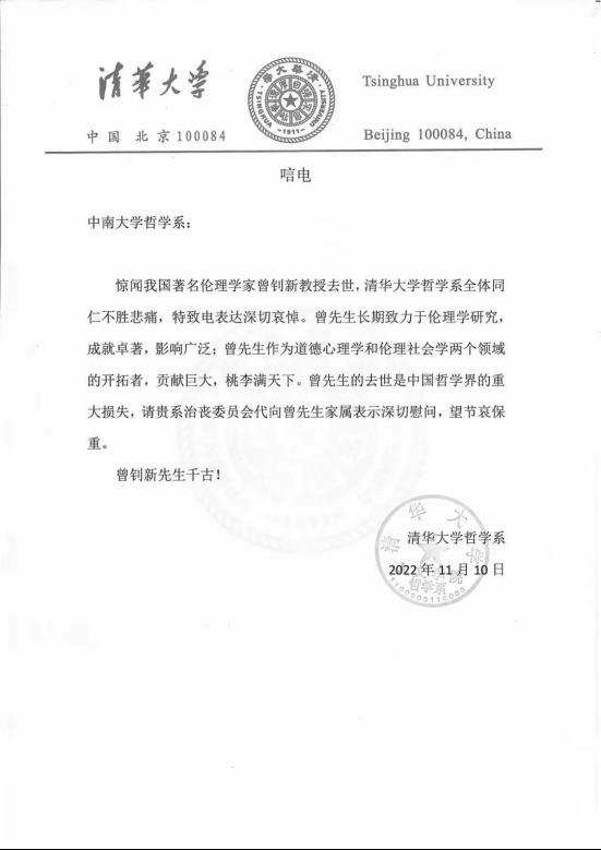 惊闻我国著名伦理学家曾钊新教授去世,清华大学哲学系全体同仁不胜悲痛,特致电表达深切哀悼。曾先生长期致力于伦理学研究,成就卓著,影响广泛;曾先生作为道德心理学和伦理社会学两个领域的开拓者,贡献巨大,桃李满天下。曾先生的去世是中国哲学界的重大损失,请贵系治丧委员会代向曾先生家属表示深切慰问,望节哀保重。