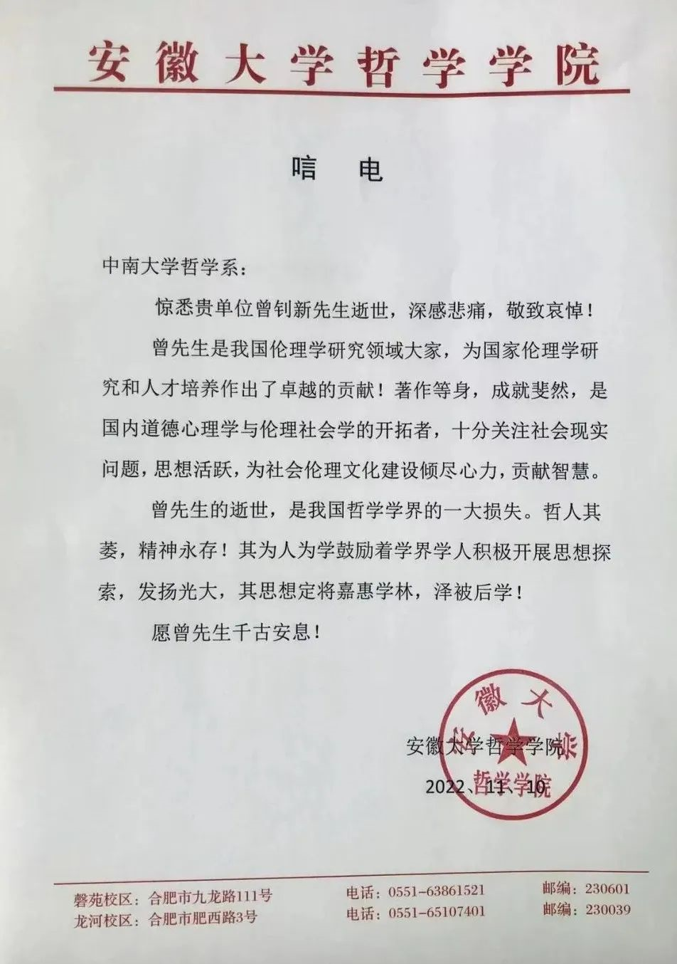 二十、安徽大学哲学学院 唁电