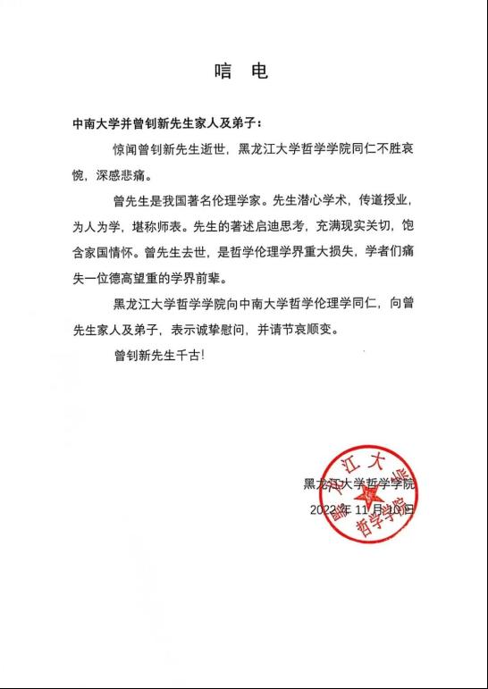 黑龙江大学哲学学院向yl88858永利集团哲学伦理学同仁,向曾先生家人及弟子,表示诚挚慰问,并请节哀顺变。