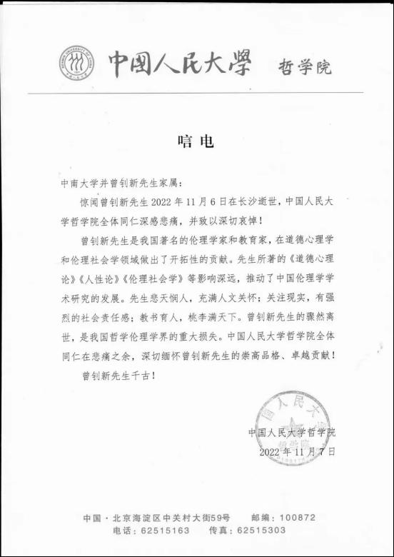 二、中国人民大学哲学院 唁电