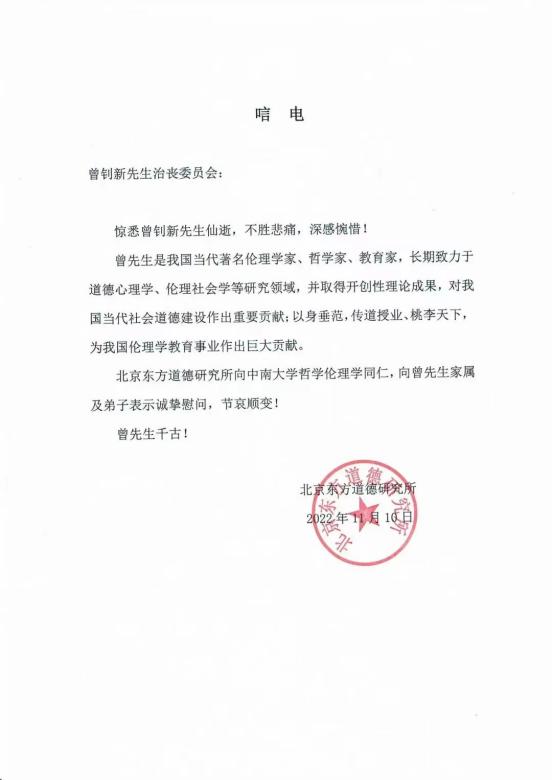 北京东方道德研究所向yl88858永利集团哲学伦理学同仁,向曾先生家属及弟子表示诚挚慰问,节哀顺变!