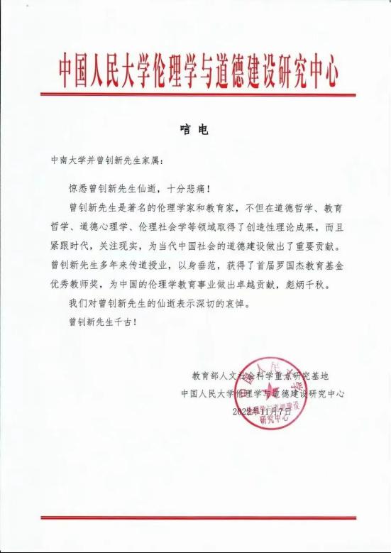 五、中国人民大学伦理学与道德建设研究中心 唁电