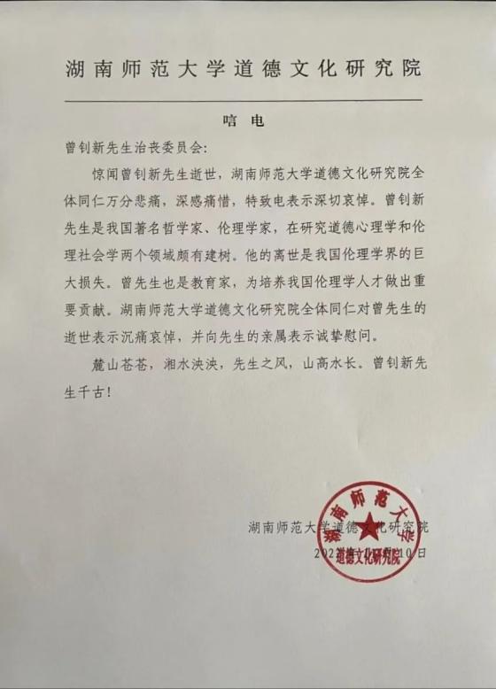八、湖南师范大学道德文化研究院 唁电