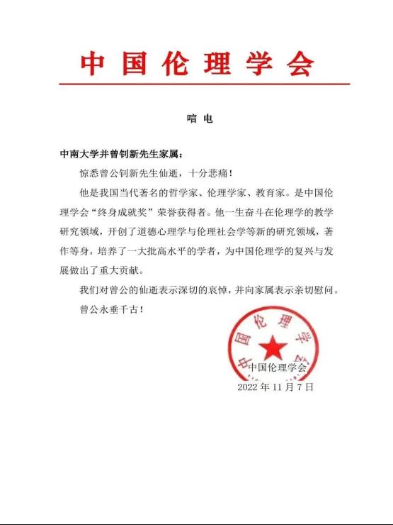 曾钊新先生的逝世是伦理学界的重大损失,湖南省伦理学学会对曾先生的逝世表示沉重哀悼,并向先生的亲属表示诚挚慰问。