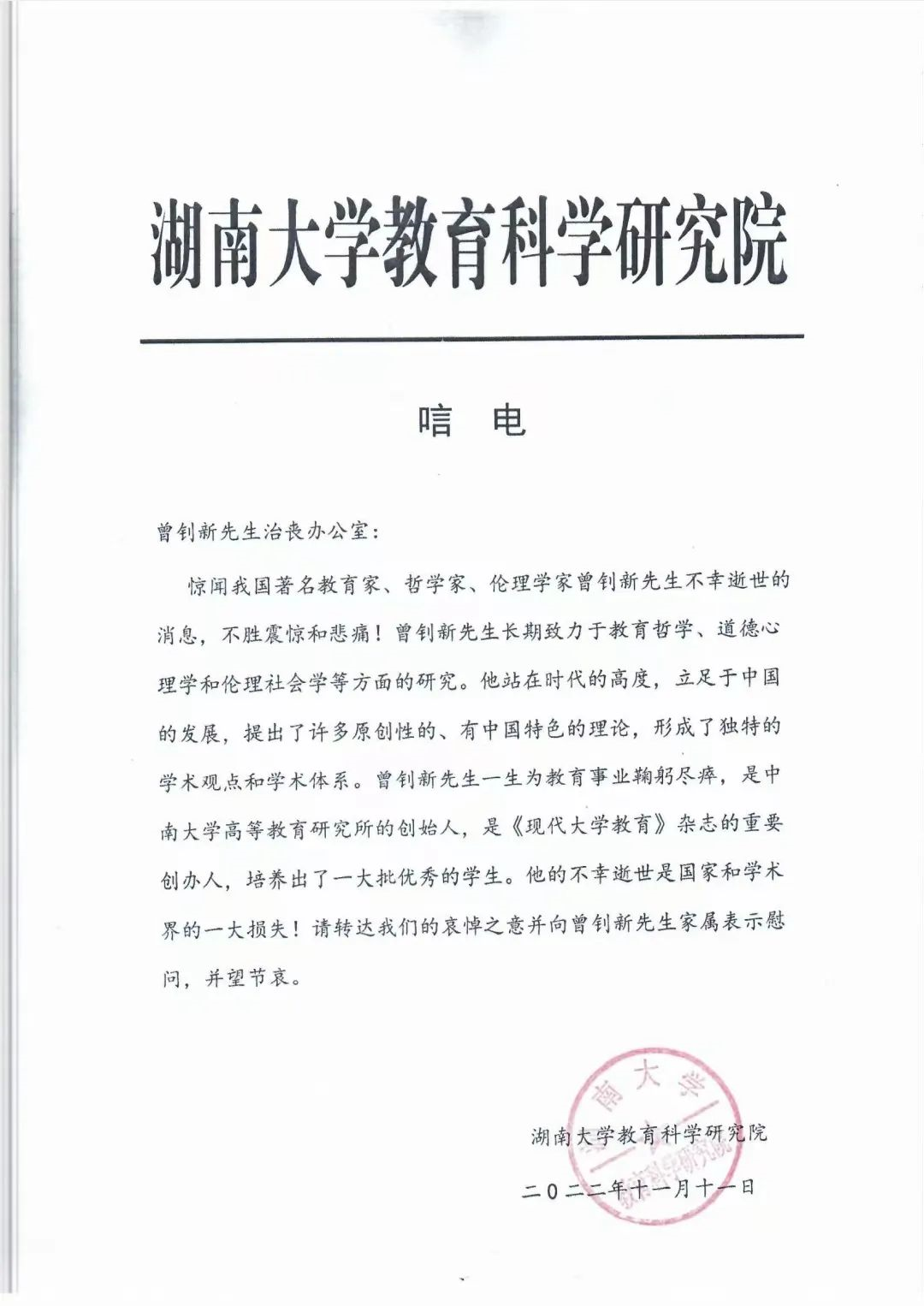 十六、湖南大学教育科学研究院 唁电